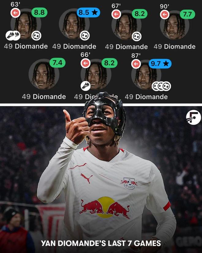 右脚边锋迪奥曼德可胜任锋线三叉戟任意位置,本赛季仅13场德甲便斩获6球3助。其爆炸速度、直线盘带与冷血终结,不可避免地被拿来与年轻的基利安·姆巴佩相提并论。去年夏天莱比锡仅以2000万欧元从莱加内斯将其挖来,如今已将这位爆红新星的转会费标为队史纪录级别的1亿欧元,双方合同要持续到2028年才到期。